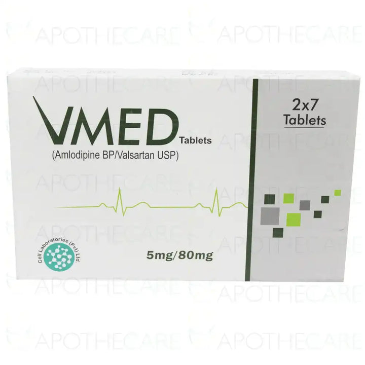 V Med 5/80 mg Tablets combine two well-established antihypertensive agents β Amlodipine Besilate (5 mg) and Valsartan (80 mg) β to deliver comprehensive blood-pressure control. This dual-action therapy is prescribed for patients with essential hypertension who require more than one medicine to achieve target blood-pressure levels.